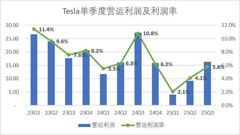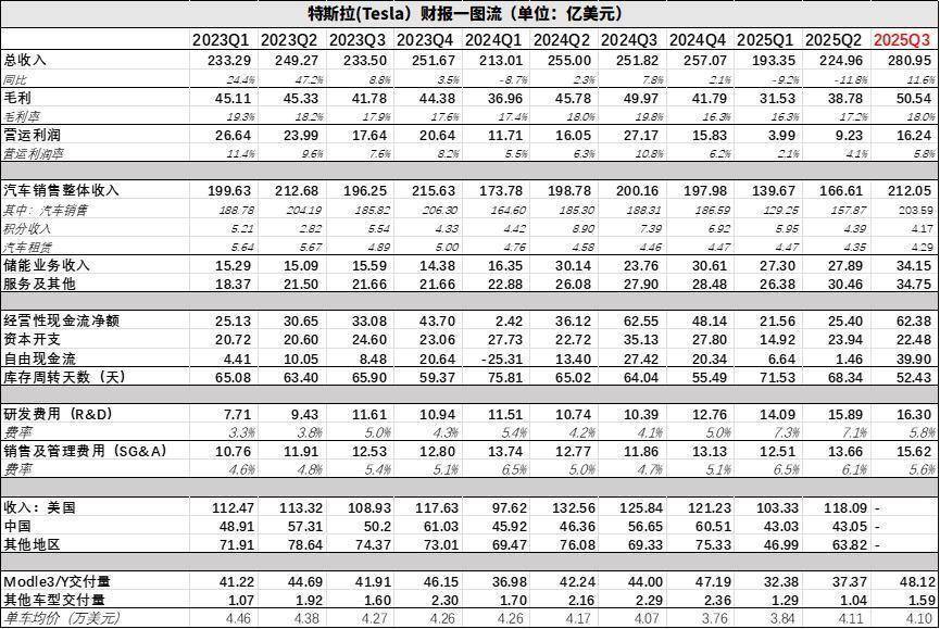 美东时间10月22日美股盘后,特斯拉公布了2025年第三季度的财务报告,录得总营收280.95亿美元,明显高于分析师预期的264亿美元;营运利润16.24亿美元,也略高于分析师预测15.8亿美元;Non-Gaap下EPS录得0.5美元,略低于分析师预测0.55美元。